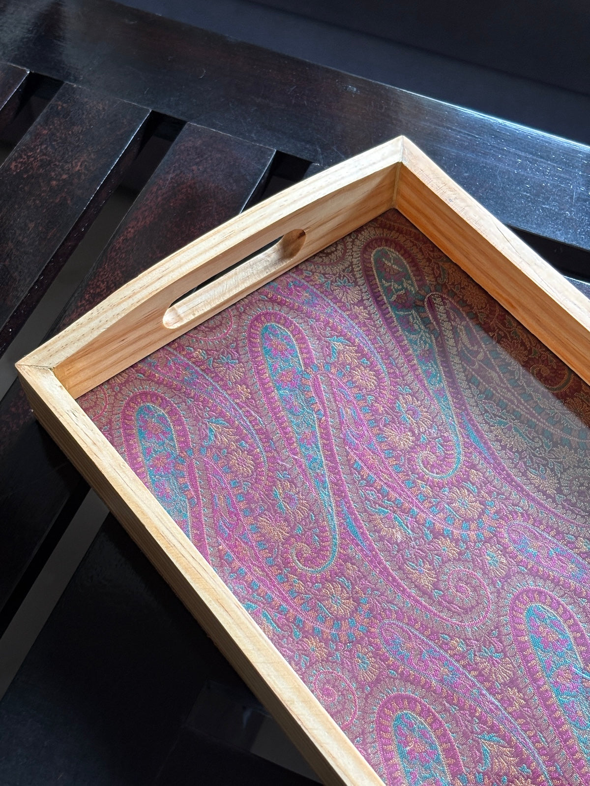 Elevate your dining décor with this Traditional Brocade Combo Set, featuring a luxurious table runner and a matching serving tray. Both pieces are adorned with intricate brocade designs, bringing a touch of festive elegance and heritage charm to your home. The table runner, sized to fit 4 seater or 6 seater dining tables, pairs beautifully with the matching tray, making it perfect for serving snacks, drinks, or displaying décor items during festivals, poojas, weddings, or special gatherings.