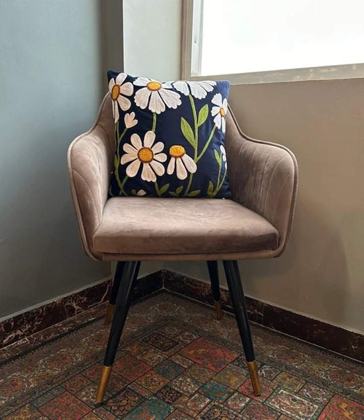 Made from luxurious navy blue silk velvet, this 16" x 16" cushion cover features an intricately hand-embroidered white floral bloom motif that exudes sophistication and charm. The plush texture of the velvet combined with the delicate embroidery makes it a perfect accent piece for living rooms, bedrooms, or any special corner of your home.